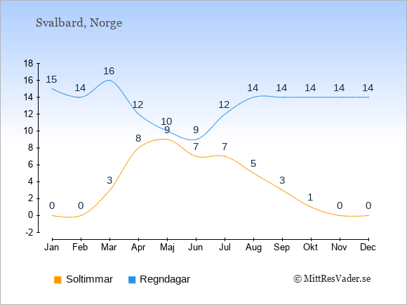 Grafen visar det genomsnittliga antalet soltimmar på Svalbard under en viss månad (soltimmar är det antalet timmar per dag där solen skinnar), och antalet regndagar (dvs. det genomsnittliga antalet dagar