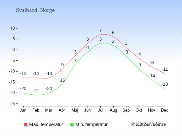 Grafen visar de genomsnittligt högsta temperaturerna på Svalbard (vanligtvis det värde som uppmätts mitt på dagen) och de genomsnittligt lägsta temperaturer (vanligtvis tidpunkten just innan soluppgång).