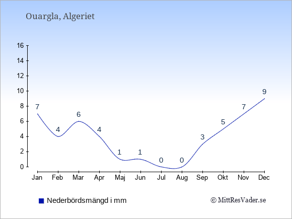 För att se hur vädret i Ouargla skiljer sig från vädret hemma, kan du också jämföra siffrorna måned för måned med motsvarande siffror för Sverige under samma period här: Ouarglas klimat.