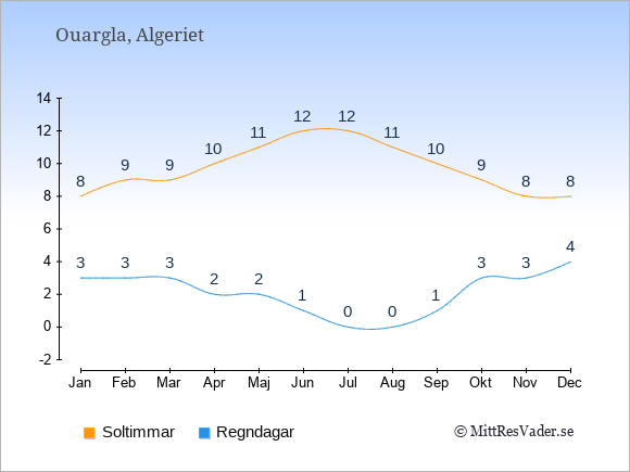 Grafen visar det genomsnittliga antalet soltimmar i Ouargla under en viss månad (soltimmar är det antalet timmar per dag där solen skinnar), och antalet regndagar (dvs. det genomsnittliga antalet dagar