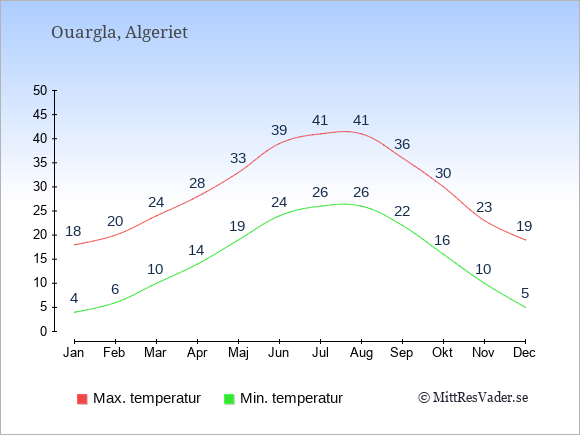 Grafen visar de genomsnittligt högsta temperaturerna i Ouargla (vanligtvis det värde som uppmätts mitt på dagen) och de genomsnittligt lägsta temperaturer (vanligtvis tidpunkten just innan soluppgång).