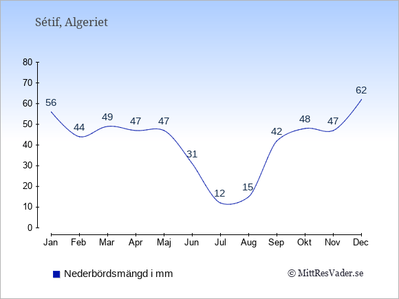 För att se hur vädret i Sétif skiljer sig från vädret hemma, kan du också jämföra siffrorna måned för måned med motsvarande siffror för Sverige under samma period här: Sétifs klimat.