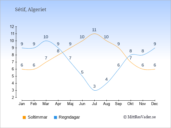 Grafen visar det genomsnittliga antalet soltimmar i Sétif under en viss månad (soltimmar är det antalet timmar per dag där solen skinnar), och antalet regndagar (dvs. det genomsnittliga antalet dagar