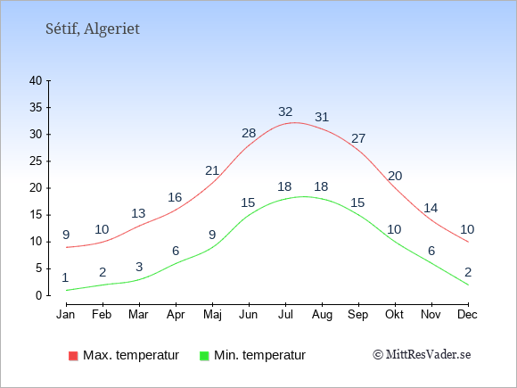 Grafen visar de genomsnittligt högsta temperaturerna i Sétif (vanligtvis det värde som uppmätts mitt på dagen) och de genomsnittligt lägsta temperaturer (vanligtvis tidpunkten just innan soluppgång).