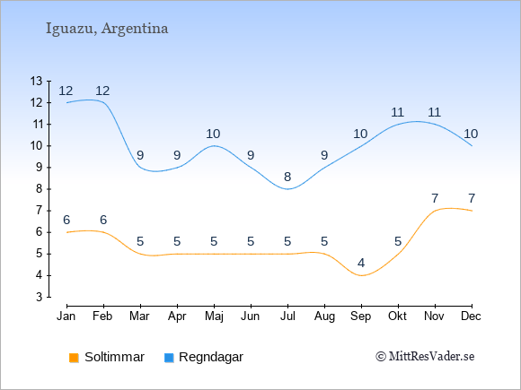 Grafen visar det genomsnittliga antalet soltimmar vid Iguazu under en viss månad (soltimmar är det antalet timmar per dag där solen skinnar), och antalet regndagar (dvs. det genomsnittliga antalet dagar