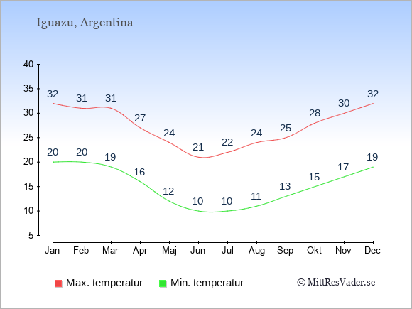 Grafen visar de genomsnittligt högsta temperaturerna vid Iguazu (vanligtvis det värde som uppmätts mitt på dagen) och de genomsnittligt lägsta temperaturer (vanligtvis tidpunkten just innan soluppgång).