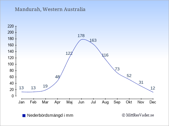 På denna sida kan du få en överblick över de statistiska klimatuppgifterna för Mandurah månad för månad jämfört med klimatet i Stockholm. Information om det historiska klimatet kan du använda för att planera din semester och hitta den bästa tiden att resa till Mandurah på.