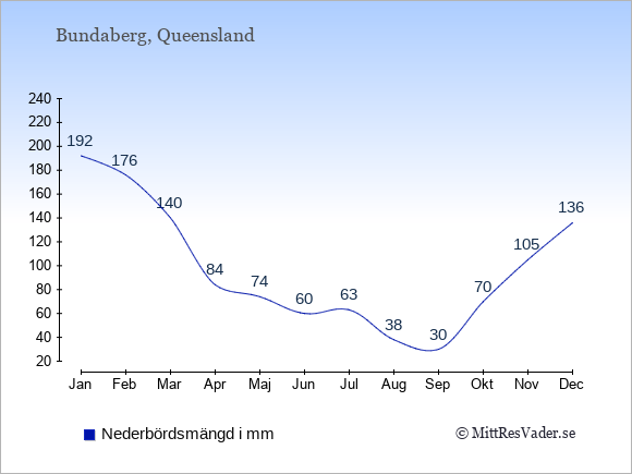 För att se hur vädret i Bundaberg skiljer sig från vädret hemma, kan du också jämföra siffrorna måned för måned med motsvarande siffror för Sverige under samma period här: Bundabergs klimat.