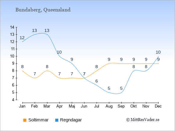 Grafen visar det genomsnittliga antalet soltimmar i Bundaberg under en viss månad (soltimmar är det antalet timmar per dag där solen skinnar), och antalet regndagar (dvs. det genomsnittliga antalet dagar