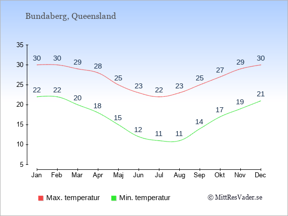 Grafen visar de genomsnittligt högsta temperaturerna i Bundaberg (vanligtvis det värde som uppmätts mitt på dagen) och de genomsnittligt lägsta temperaturer (vanligtvis tidpunkten just innan soluppgång).