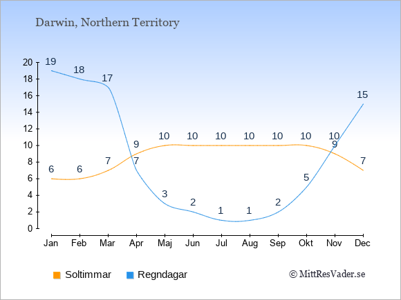 Grafen visar det genomsnittliga antalet soltimmar i Darwin under en viss månad (soltimmar är det antalet timmar per dag där solen skinnar), och antalet regndagar (dvs. det genomsnittliga antalet dagar