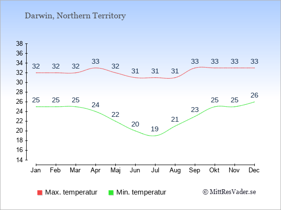 Grafen visar de genomsnittligt högsta temperaturerna i Darwin (vanligtvis det värde som uppmätts mitt på dagen) och de genomsnittligt lägsta temperaturer (vanligtvis tidpunkten just innan soluppgång).