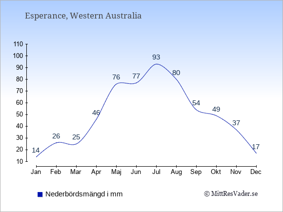 För att se hur vädret i Esperance skiljer sig från vädret hemma, kan du också jämföra siffrorna måned för måned med motsvarande siffror för Sverige under samma period här: Esperances klimat.