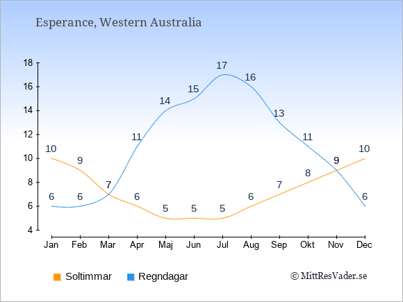 Grafen visar det genomsnittliga antalet soltimmar i Esperance under en viss månad (soltimmar är det antalet timmar per dag där solen skinnar), och antalet regndagar (dvs. det genomsnittliga antalet dagar