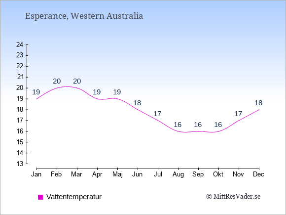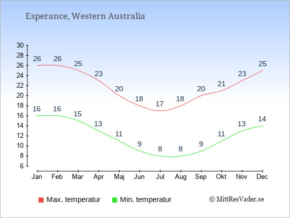Grafen visar de genomsnittligt högsta temperaturerna i Esperance (vanligtvis det värde som uppmätts mitt på dagen) och de genomsnittligt lägsta temperaturer (vanligtvis tidpunkten just innan soluppgång).