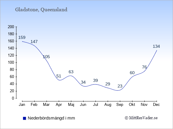 För att se hur vädret i Gladstone skiljer sig från vädret hemma, kan du också jämföra siffrorna måned för måned med motsvarande siffror för Sverige under samma period här: Gladstones klimat.