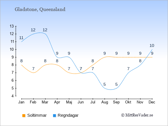 Grafen visar det genomsnittliga antalet soltimmar i Gladstone under en viss månad (soltimmar är det antalet timmar per dag där solen skinnar), och antalet regndagar (dvs. det genomsnittliga antalet dagar