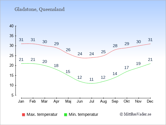 Grafen visar de genomsnittligt högsta temperaturerna i Gladstone (vanligtvis det värde som uppmätts mitt på dagen) och de genomsnittligt lägsta temperaturer (vanligtvis tidpunkten just innan soluppgång).