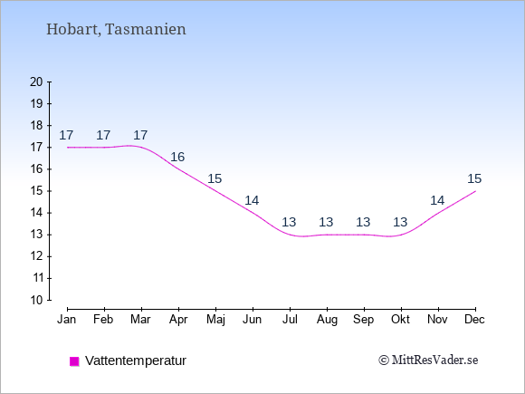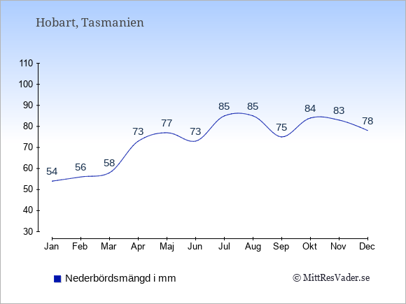 För att se hur vädret i Hobart skiljer sig från vädret hemma, kan du också jämföra siffrorna måned för måned med motsvarande siffror för Sverige under samma period här: Hobarts klimat.