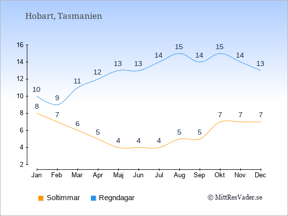 Väder i Hobart: Soltimmar och regndagar
