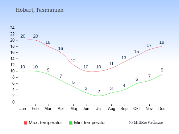 Grafen visar de genomsnittligt högsta temperaturerna i Hobart (vanligtvis det värde som uppmätts mitt på dagen) och de genomsnittligt lägsta temperaturer (vanligtvis tidpunkten just innan soluppgång).