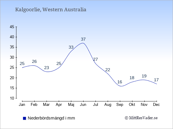 För att se hur vädret i Kalgoorlie skiljer sig från vädret hemma, kan du också jämföra siffrorna måned för måned med motsvarande siffror för Sverige under samma period här: Kalgoorlies klimat.