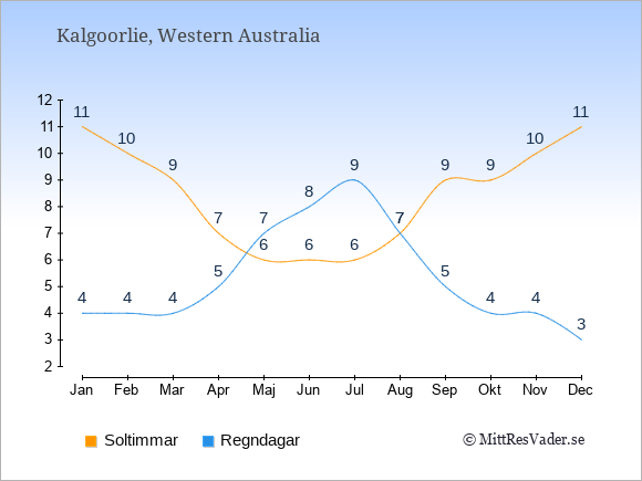 Grafen visar det genomsnittliga antalet soltimmar i Kalgoorlie under en viss månad (soltimmar är det antalet timmar per dag där solen skinnar), och antalet regndagar (dvs. det genomsnittliga antalet dagar