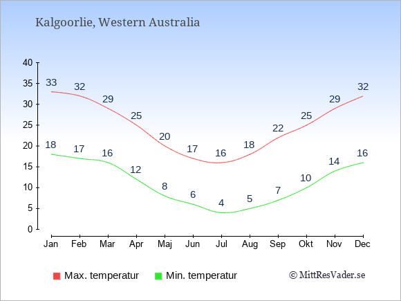 Grafen visar de genomsnittligt högsta temperaturerna i Kalgoorlie (vanligtvis det värde som uppmätts mitt på dagen) och de genomsnittligt lägsta temperaturer (vanligtvis tidpunkten just innan soluppgång).