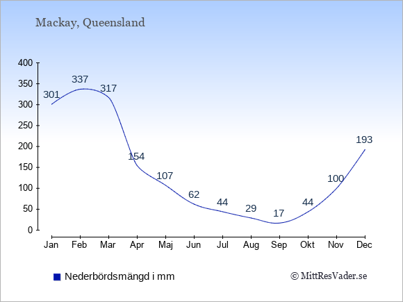 För att se hur vädret i Mackay skiljer sig från vädret hemma, kan du också jämföra siffrorna måned för måned med motsvarande siffror för Sverige under samma period här: Mackays klimat.