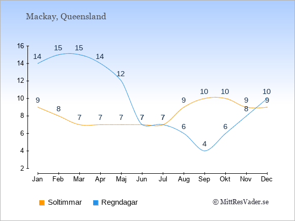 Grafen visar det genomsnittliga antalet soltimmar i Mackay under en viss månad (soltimmar är det antalet timmar per dag där solen skinnar), och antalet regndagar (dvs. det genomsnittliga antalet dagar