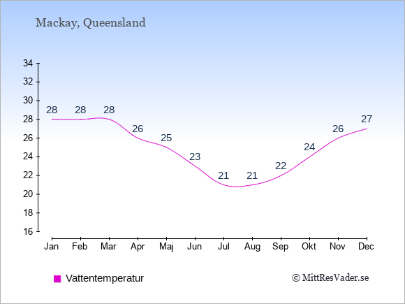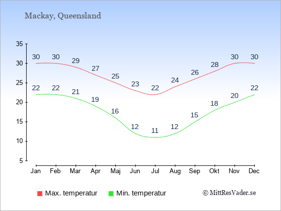 Grafen visar de genomsnittligt högsta temperaturerna i Mackay (vanligtvis det värde som uppmätts mitt på dagen) och de genomsnittligt lägsta temperaturer (vanligtvis tidpunkten just innan soluppgång).