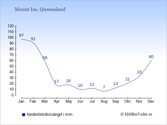 För att se hur vädret i Mount Isa skiljer sig från vädret hemma, kan du också jämföra siffrorna måned för måned med motsvarande siffror för Sverige under samma period här: Mount Isas klimat.