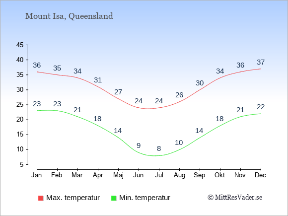 Grafen visar de genomsnittligt högsta temperaturerna i Mount Isa (vanligtvis det värde som uppmätts mitt på dagen) och de genomsnittligt lägsta temperaturer (vanligtvis tidpunkten just innan soluppgång).