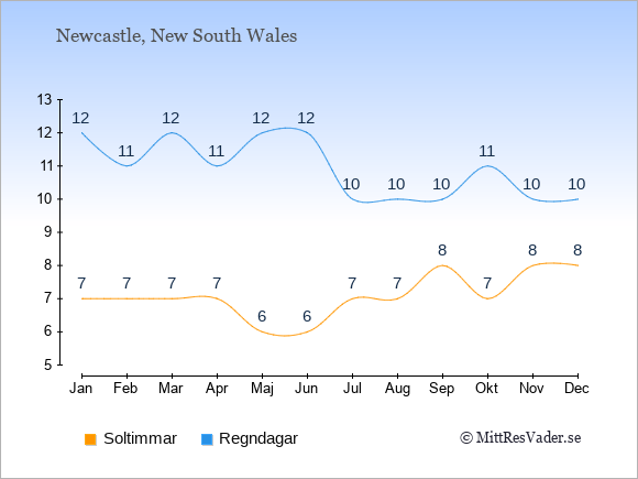 Grafen visar det genomsnittliga antalet soltimmar i Newcastle under en viss månad (soltimmar är det antalet timmar per dag där solen skinnar), och antalet regndagar (dvs. det genomsnittliga antalet dagar