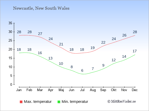Grafen visar de genomsnittligt högsta temperaturerna i Newcastle (vanligtvis det värde som uppmätts mitt på dagen) och de genomsnittligt lägsta temperaturer (vanligtvis tidpunkten just innan soluppgång).