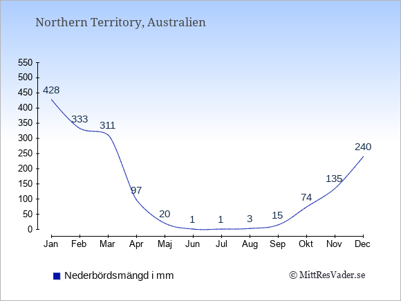 För att se hur vädret i Northern Territory skiljer sig från vädret hemma, kan du också jämföra siffrorna måned för måned med motsvarande siffror för Sverige under samma period här: Northern Territorys klimat.