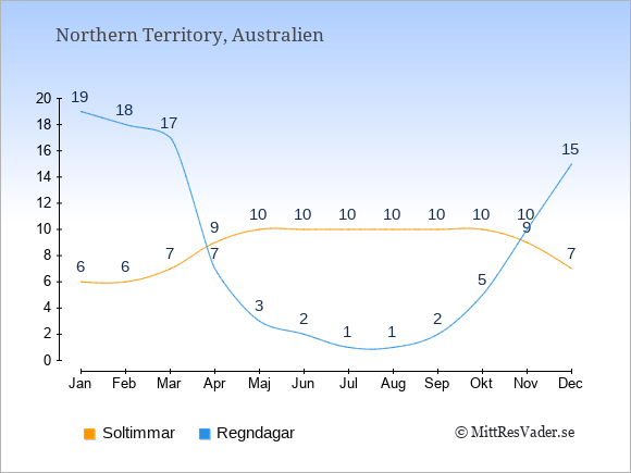 Grafen visar det genomsnittliga antalet soltimmar i Northern Territory under en viss månad (soltimmar är det antalet timmar per dag där solen skinnar), och antalet regndagar (dvs. det genomsnittliga antalet dagar