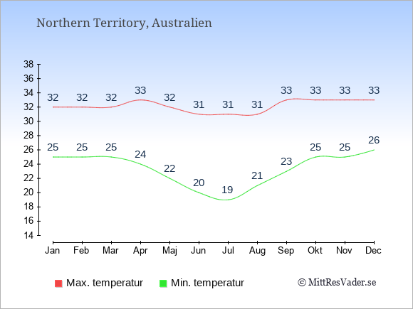 Grafen visar de genomsnittligt högsta temperaturerna i Northern Territory (vanligtvis det värde som uppmätts mitt på dagen) och de genomsnittligt lägsta temperaturer (vanligtvis tidpunkten just innan soluppgång).
