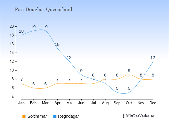 Grafen visar det genomsnittliga antalet soltimmar i Port Douglas under en viss månad (soltimmar är det antalet timmar per dag där solen skinnar), och antalet regndagar (dvs. det genomsnittliga antalet dagar