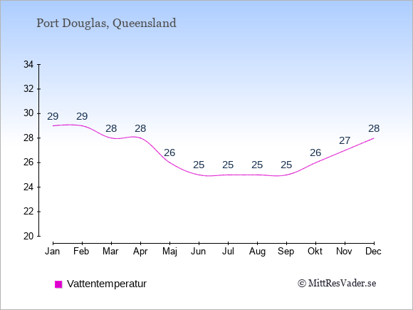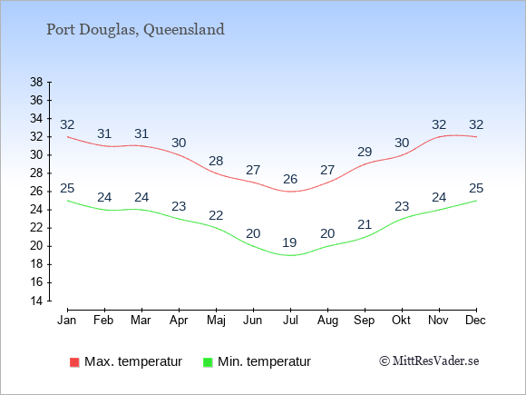 Grafen visar de genomsnittligt högsta temperaturerna i Port Douglas (vanligtvis det värde som uppmätts mitt på dagen) och de genomsnittligt lägsta temperaturer (vanligtvis tidpunkten just innan soluppgång).