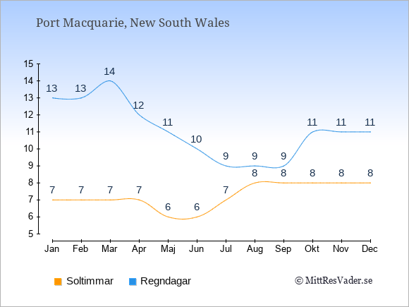 Grafen visar det genomsnittliga antalet soltimmar i Port Macquarie under en viss månad (soltimmar är det antalet timmar per dag där solen skinnar), och antalet regndagar (dvs. det genomsnittliga antalet dagar