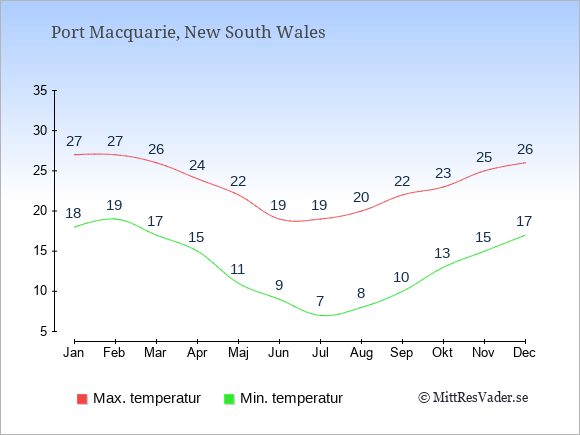 Grafen visar de genomsnittligt högsta temperaturerna i Port Macquarie (vanligtvis det värde som uppmätts mitt på dagen) och de genomsnittligt lägsta temperaturer (vanligtvis tidpunkten just innan soluppgång).
