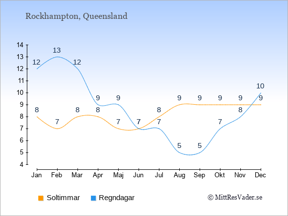 Grafen visar det genomsnittliga antalet soltimmar i Rockhampton under en viss månad (soltimmar är det antalet timmar per dag där solen skinnar), och antalet regndagar (dvs. det genomsnittliga antalet dagar