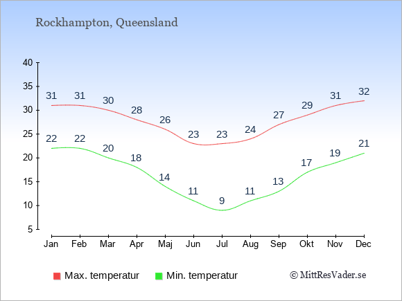 Grafen visar de genomsnittligt högsta temperaturerna i Rockhampton (vanligtvis det värde som uppmätts mitt på dagen) och de genomsnittligt lägsta temperaturer (vanligtvis tidpunkten just innan soluppgång).