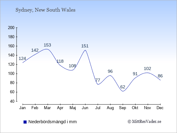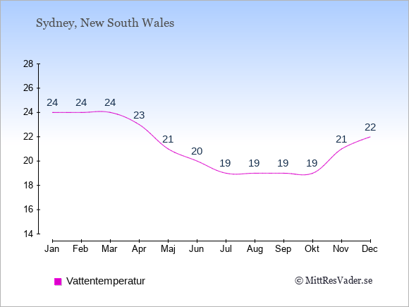 För att se hur vädret i Sydney skiljer sig från vädret hemma, kan du också jämföra siffrorna måned för måned med motsvarande siffror för Sverige under samma period här: Sydneys klimat.