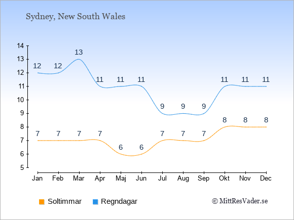 Grafen visar det genomsnittliga antalet soltimmar i Sydney under en viss månad (soltimmar är det antalet timmar per dag där solen skinnar), och antalet regndagar (dvs. det genomsnittliga antalet dagar