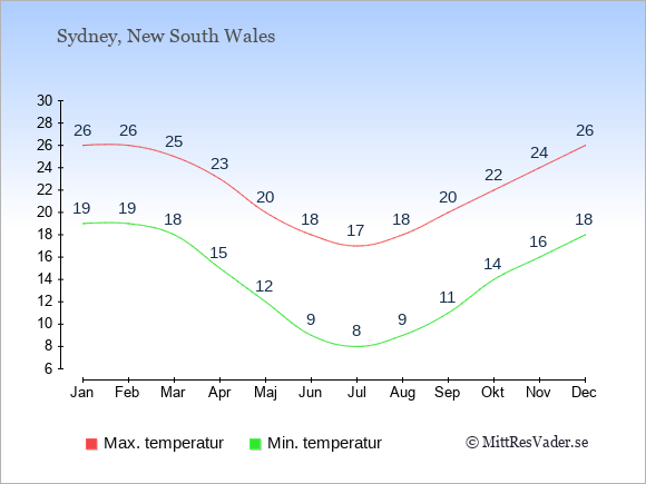 Grafen visar de genomsnittligt högsta temperaturerna i Sydney (vanligtvis det värde som uppmätts mitt på dagen) och de genomsnittligt lägsta temperaturer (vanligtvis tidpunkten just innan soluppgång).