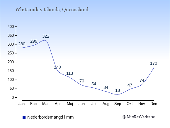 För att se hur vädret på Whitsunday Islands skiljer sig från vädret hemma, kan du också jämföra siffrorna måned för måned med motsvarande siffror för Sverige under samma period här: Whitsunday Islands klimat.