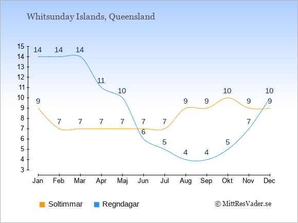Grafen visar det genomsnittliga antalet soltimmar på Whitsunday Islands under en viss månad (soltimmar är det antalet timmar per dag där solen skinnar), och antalet regndagar (dvs. det genomsnittliga antalet dagar