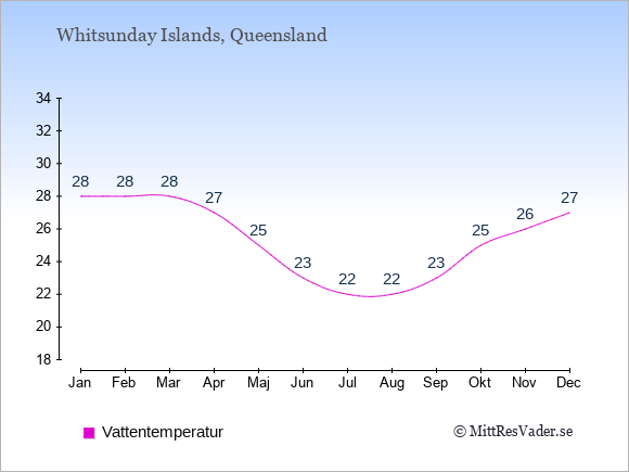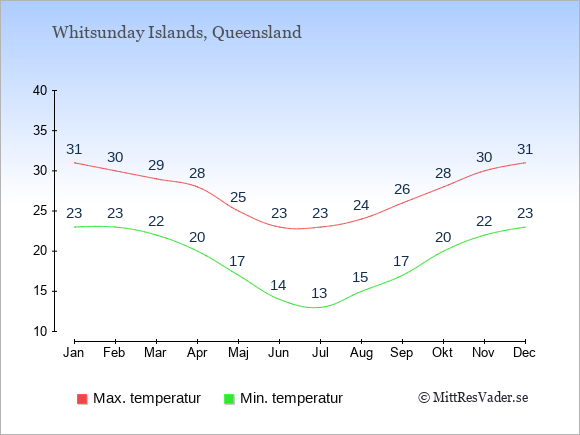 Grafen visar de genomsnittligt högsta temperaturerna på Whitsunday Islands (vanligtvis det värde som uppmätts mitt på dagen) och de genomsnittligt lägsta temperaturer (vanligtvis tidpunkten just innan soluppgång).